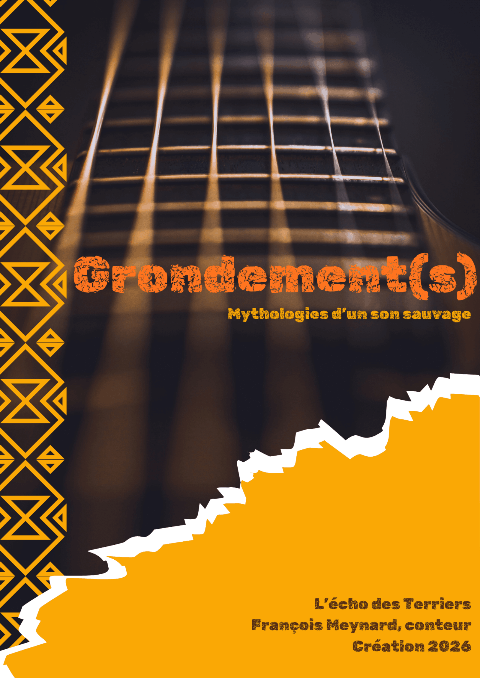 « J’ai commencé à conter lors d’un service civil, il y a fort longtemps, parachuté dans un centre de loisirs. Puis les histoires ont fait leur chemin et m’ont poussé à me former à cet art si délicat. Auprès de Michel Hindenoch tout d’abord que j’ai ensuite retrouvé au sein de l’école Kom Panis avec Myriam Pellicane et Jean-Loïc Le Quellec, entre autres. Une formation solide et fertile, au carrefour de l’anthropologie et de la pratique artistique qui m’a permis de faire la rencontre avec mes frères et soeurs Piverts, conteurs au grand coeur et conteuses ambitieuses, avec qui je partage recherches, questionnements et expériences. Mon travail est celui d’un conteur d’aujourd’hui, qui explore les zones de contact entre tradition orale et création contemporaine. Je puise dans les répertoires classiques du conte tout en cherchant comment ces récits anciens peuvent éclairer nos présents.Grondement(s) est le prolongement logique de ce processus entamé depuis 5 ans..L’Écho des Terriers est le nom de ma compagnie solitaire,inspiré de ces animaux qui vivent sous terre et surgissent subrepticement à la surface. Les histoires aussi viennent des profondeurs, remontent à la lumière, creusent leurs galeries dans nos coeurs et nos consciences. Mon rôle est de les aider à émerger, de leur prêter ma voix pour qu’elles continuent leur chemin. »